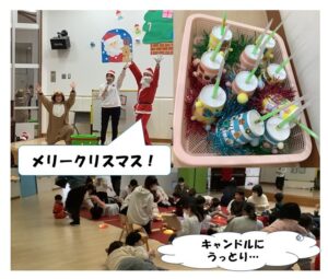 次は講師の先生をお呼びしてリトミック。「赤鼻のトナカイ」に合わせて、手作りの楽器を鳴らしました。クラスで異なる楽器を作り「その楽器なあに?」と他のクラスの楽器を興味津々で見つめるお友だちもいました。その後はキャンドルの優しい灯りを見ながらゆったり横になり、それぞれが心地よい形で音や時間を楽しみました。